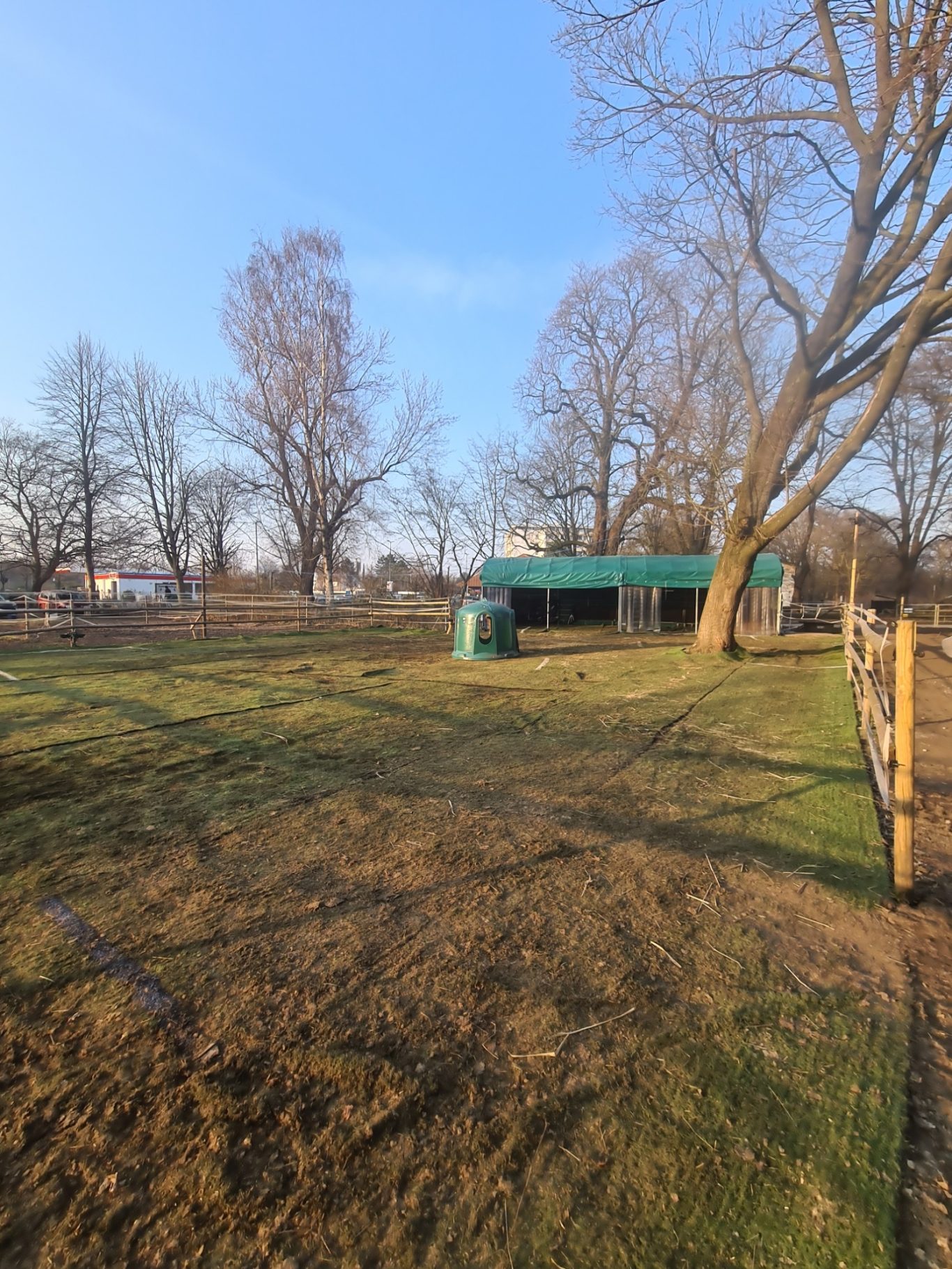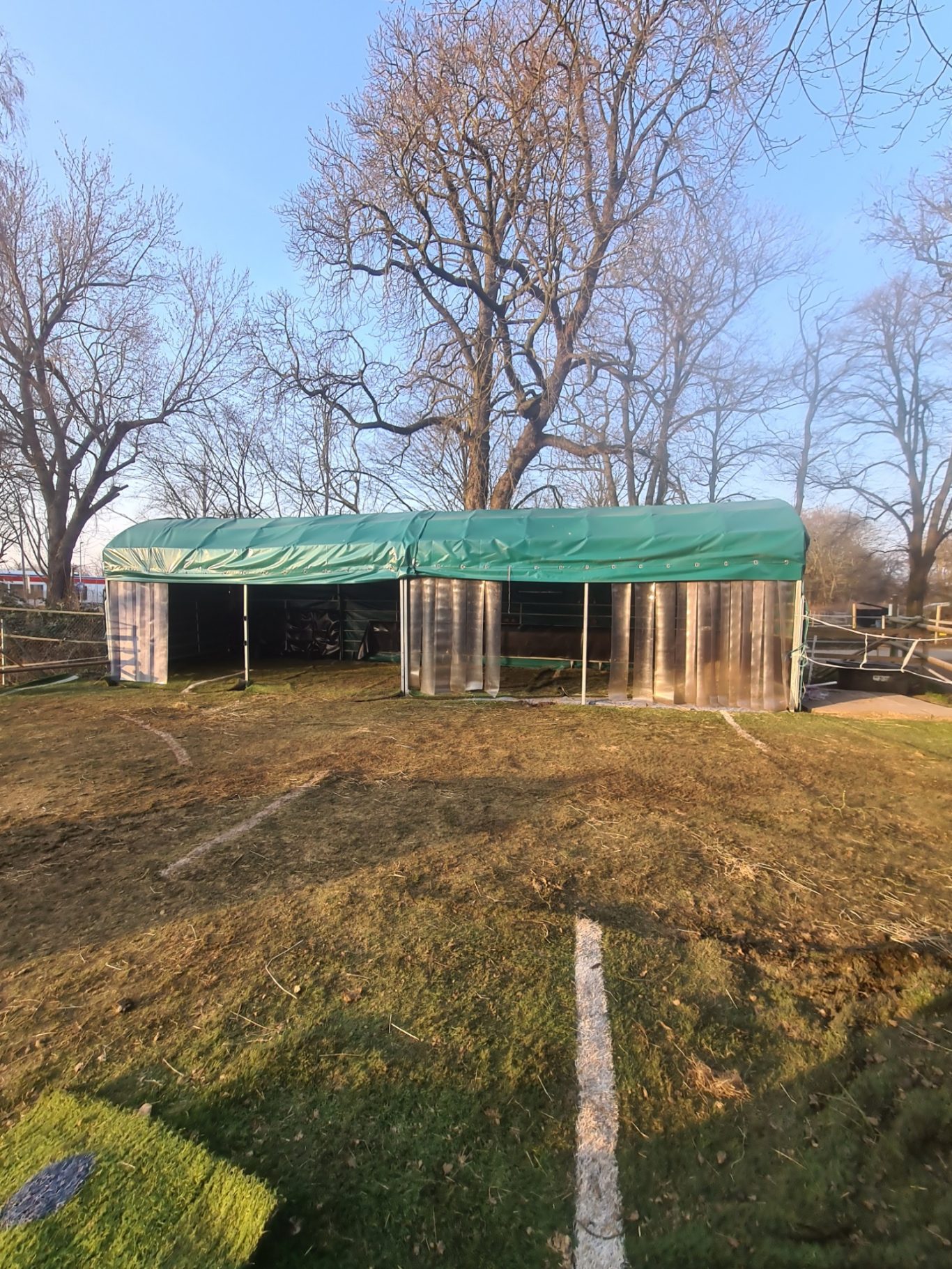 Im Offenstall gibt es ein 3,6 m x 12 m großes Weidezelt als Unterstand. Heu wird aus einer Heuglocke gefüttert, die überdacht ist. Auf dem gesamten ca. 550 m² großen Areal liegt Kunstrasen und Sand. Dies hat den Vorteil, dass es auch bei viel Regen nicht matschig ist.